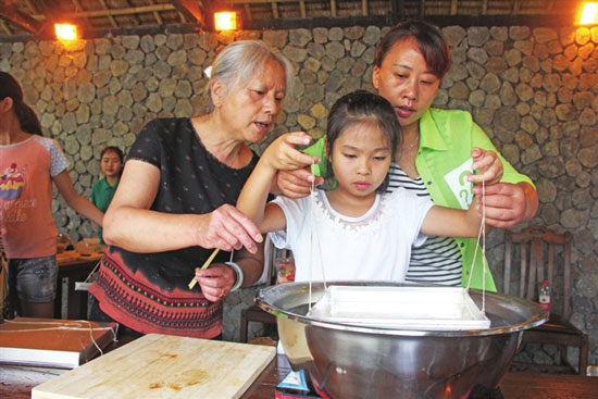 近日,我区电商运营公司联合土坎栾氏苕粉在仙女山镇芳草地小区开展“土坎苕粉走进社区”活动,并指导附近居民和游客制作苕粉,让武隆土特产走近大众视野,深受居民和游客欢迎。图为游客体验苕粉制作。 (何小莉/摄)