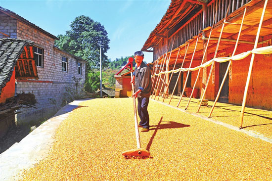 入秋后,我区各地种植的玉米、水稻、辣椒等作物相继成熟,山乡农家全部进入秋忙时节,到处是采收、晾晒秋实的场景。图为火炉镇徐家村村民陈胜云正在忙着晾晒丰收的玉米。