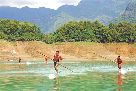 近日,石桥苗族土家族乡进行2017年独竹漂初验收工作,训练者往返转体滑行300米不落水,25人均顺利完成。为提高独竹漂的专业化水平,该乡近期还将引进贵州省资深教练对独竹漂潜力者进行强化训练。