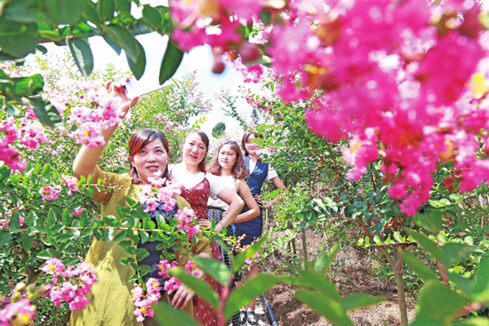 近日,桐梓镇官田村回阳山,上千亩紫薇园里竞相绽放,姹紫嫣红,争奇斗艳,煞是好看,吸引不少游客前往避暑赏花。该紫薇园海拔800米,平均气温20℃,是当地打造的特色乡村旅游示范点。眼下刚进入盛花期,赏花时间将持续一个月。图为游客流连花丛间。