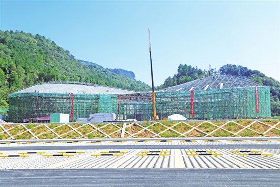 近日,记者在白马山望仙崖景区游客接待中心看到,工人们正忙着进行主体钢网架、玻璃幕墙安装和室内墙体砌筑。据了解,目前,该工程项目已进入主体工程扫尾阶段,内部装饰已启动招标工作,共完成投资3000万元,预计明年三月底全面完工。图为雏形初现的游客接待中心。