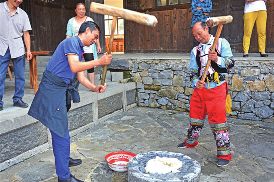 游客体验打糍粑。