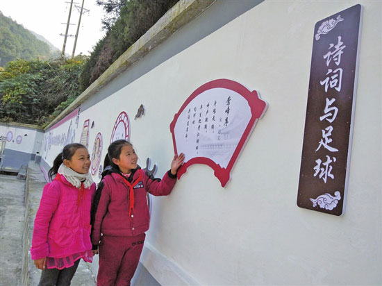 “志逾翠柏、诗润童心。”近年来,石桥乡贾角小学加强校园文化建设,着力塑造学校个性形象,营造浓厚校园文化氛围和优美的校园环境。精心打造的文化墙,成为校园里最美的风景。图为下课后,学生来到文化墙角品读诗词,在古诗词中受到熏陶和教育。