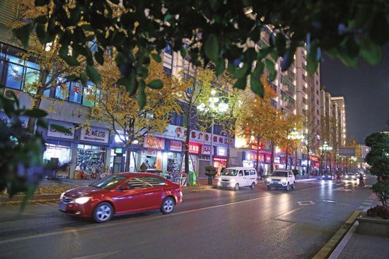 冬季夜晚,城区武仙路沿线金黄璀璨,银杏叶随风飘荡,在灯光的照耀下宛若梦幻童话世界,吸引了众多市民和游客驻足欣赏。图为夜色下的城区武仙路一角。