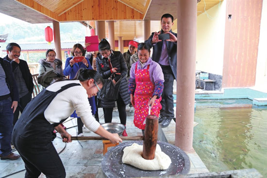 冬至将至,寒冬来临,我区各农家乐呈现冷天不“冷”的景象,不少游客在农家乐打糍粑、磨豆花,享受劳动的乐趣。图为石桥苗族土家族乡某农家乐内游客体验打糍粑。 (李洪生/摄)