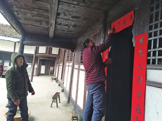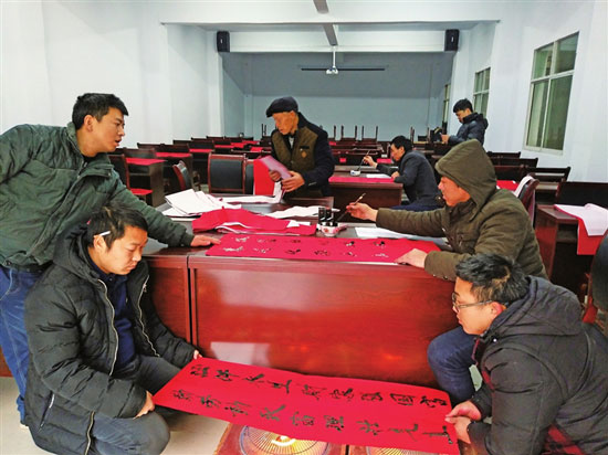 春节即将到来,空气中弥漫着节庆的味道。连日来,为让社区或村居百姓过一个喜庆的新年,全区各部门和镇乡街及社会爱心组织相继开展了送温暖、送祝福等慰问活动,其中,邀请书法名家或本土书法人员现场书写春联等活动深受群众喜爱,为传统节日增添了更多喜庆和寓意。图为浩口苗族仡佬族乡落心村为村民赠送并张贴春联。 (郑龙勇/摄)