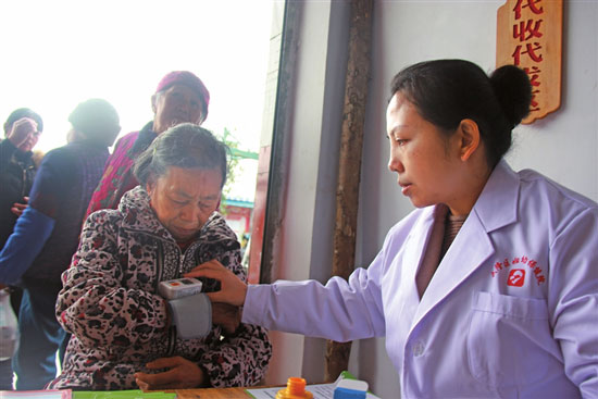 3月5日,区妇幼保健院工作人员来到羊角镇艳山红村,开展送医送药义诊活动,为村民进行量血压、测血糖等常规的身体检查,并发放板蓝根、藿香正气水、蛇胆川贝液等家庭常备药品。 (唐敏/摄)