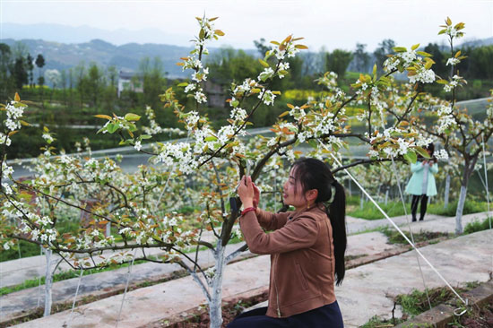 燕子来时新社,梨花落后清明。连日来,鸭江镇显灵村万亩梨花竞相开放,白花红蕊与青黄相间的嫩叶,遍布山头,逐笑春风。村民提醒,清明前后梨花谢去,赏花得抓紧。 (任正义/摄)