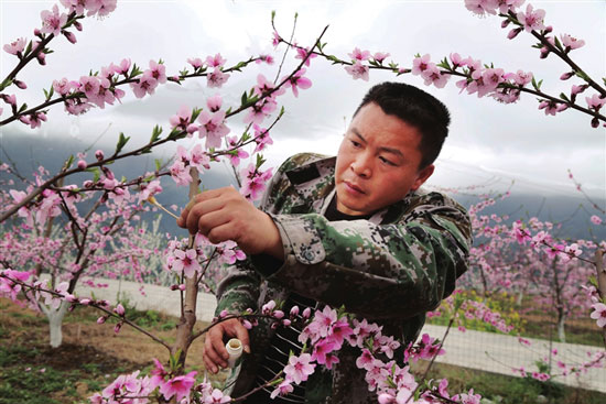 3月18日,初春时节,羊角镇永隆村桃花竞相绽放,果农王语欢正抓紧农时给桃树人工授粉。