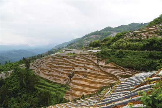 日前,石桥苗族土家族乡六棱村望阳农业社,一条条“白色丝带”点缀山间,将山乡田野装点得美丽如画。据了解,今年六棱村发展了2300亩烤烟,预计收入690万元。烤烟已成为村民增收致富的特色产业。 (李洪生/摄)