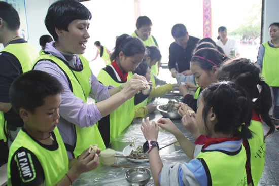 5月30日,石桥乡中心校45名留守儿童在民盟武隆支部10位志愿者的带领下,在石桥湖畔开展“保护母亲河·我们同行动”捡拾垃圾活动,在校园食堂里进行包饺子比赛,在教室分享爱心大礼包,提前过了一个既忙碌又高兴的儿童节。 (蒋 颖/摄)