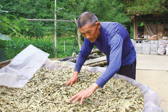 接龙乡小坪村小沟组村民高明兴,从40岁开始学习制作传统手工香,他的这项手艺已被列为我区非物质文化遗产。传统手工香制作材料均从大自然中择料,从采晒摏打糯叶、切竹编、和原料到制作成手工香成品,前后需经60多道工序,高明兴每一道工序都坚持手工制作。图为高明兴正在查看糯叶晒干程度。