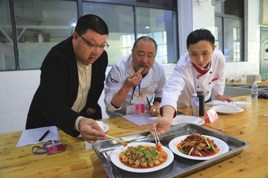 活动现场,中式烹饪技能比赛竞争异常激烈。三十平米见方的厨房内,30多名选手一字排开,刀光剑影式地切,精心细致地雕,悠然浑厚地剁……普普通通的食材在厨师手上“脱胎换骨”。除了制作碗碗羊肉、粉蒸羊肉、糖醋鱼片、鱼香肉丝以及家常黄焖鸡等指定菜品外,辣子羊肉、蕨巴汤圆、“采花大盗”以及“孔雀开屏”等一道道创意精品菜肴被搬上桌面。