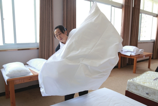 评委们拿着标尺,依次对餐盘间距、每杯酒的容量等仔细测量,对床单能否一次抛到位,是否平整进行检查。