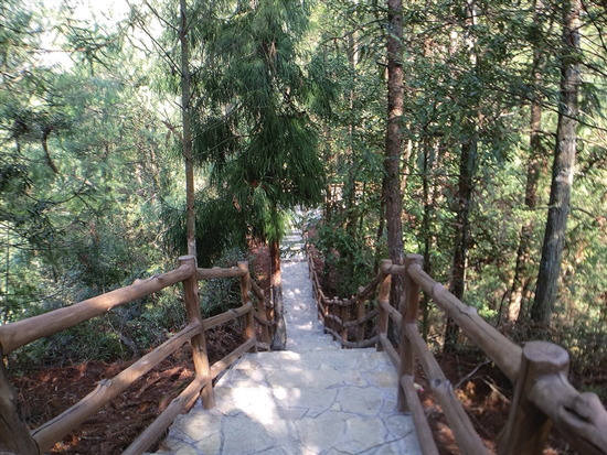 石板小路穿插在茂密的树林间,若隐若现。走累了,坐在小亭子歇一歇,呼吸负氧离子,静听虫鸣鸟叫,寻找一份宁静致远,体味岁月静好,乐哉!