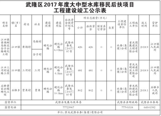 武隆区2017年度大中型水库移民后扶项目工程建设竣工公示表