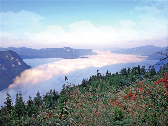 云海是自然景观,是山岳风景的重要景观之一。云顶高度低于山顶高度,当人们在高山之巅俯首云层时,看到的是漫无边际的云,如临于大海之滨,波起峰涌,浪花飞溅,惊涛拍岸。图为在仙女山镇荆竹村茶阳坪看到乌江上空一片云海。