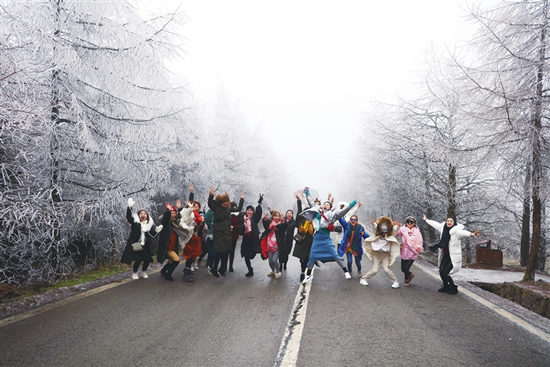 12月28日,仙女山又飘起雪花,这是今冬以来下的第二场雪。当看到公路两旁美丽的雾凇景观,游客纷纷走下车来,尽情欣赏雪山美景,拍照留影。