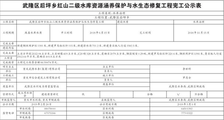武隆区后坪乡红山二级水库资源涵养保护与水生态修复工程完工公示表