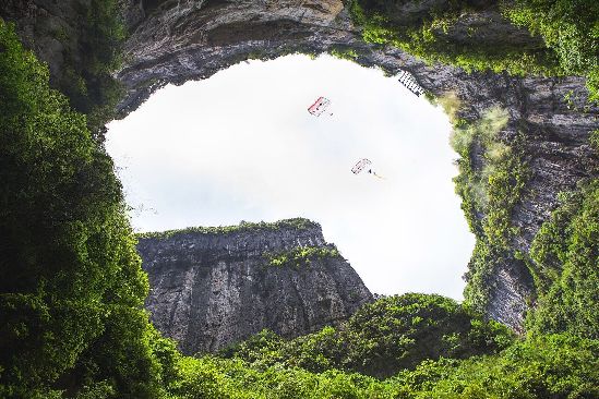 5月1日,国际顶尖翼装飞行高手转战世界最大天坑桥群,挑战世界首次低空跳伞穿越天生三桥。