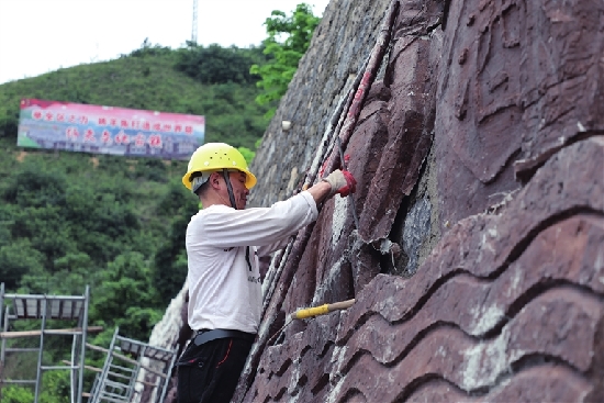 羊角古镇农耕文化长廊景观打造将于6月中下旬全面完工,届时,游客及当地居民可在观光游览体验特色美食的同时,能有更多的人文景观视觉体验。图为工人正在农耕文化长廊加紧施工。
