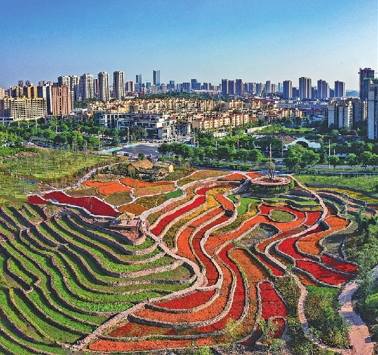 望山见水公园展区15个灯组,体现尊重自然和保护环境的绿色发展理念。望山公园以“蝉噪林逾静,鸟鸣山更幽”为意境,展现绿色环保的铜梁生态之美,以鸟类、田园花草造型为主。见水公园以“水泽万物,繁花似锦”作为设计思路,以花朵、昆虫造型为主。