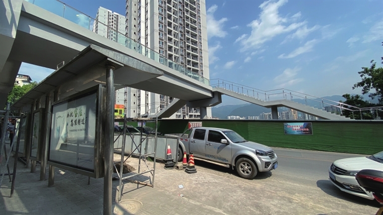 项目现场,人行天桥护栏以及部分防护玻璃已安装完毕,天桥下的街道也在有条不紊地安装地砖。