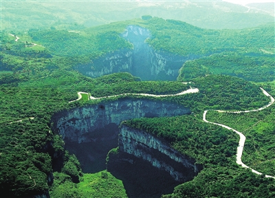 天生三桥由天龙桥、青龙桥、黑龙桥三座平均高度300米以上的天然石拱桥呈纵向排列,其规模宏大、气势磅礴,在不足1.2千米的范围内平行横跨在羊水河峡谷之上,将两岸山体连在一起。三座天然石拱桥之间有青龙天坑、神鹰天坑两个天坑,形成了“三桥夹两坑”的世界奇特景观。
