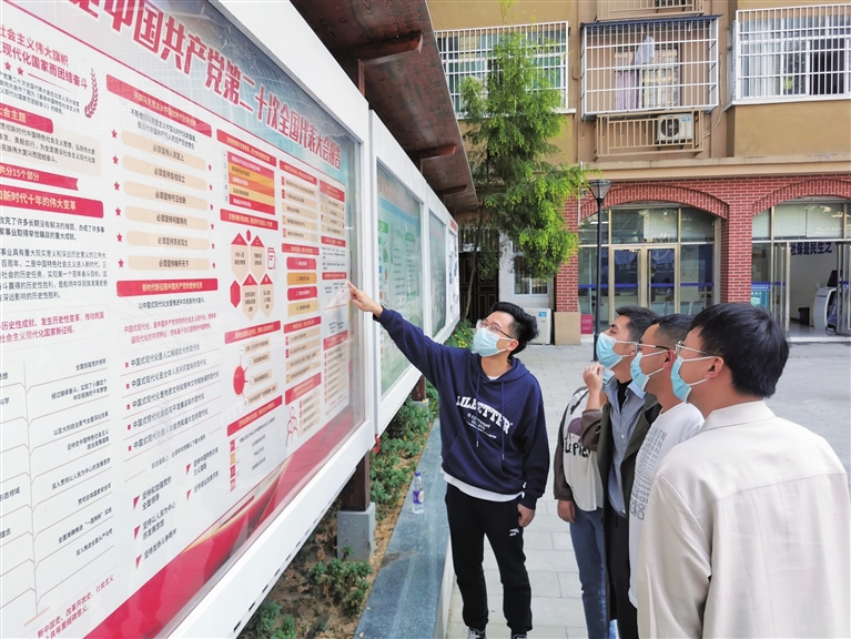 凤山街道公共服务大厅门前,新制作好的党的二十大宣传展板吸引居民驻足阅览。 (陈娜霖/摄)